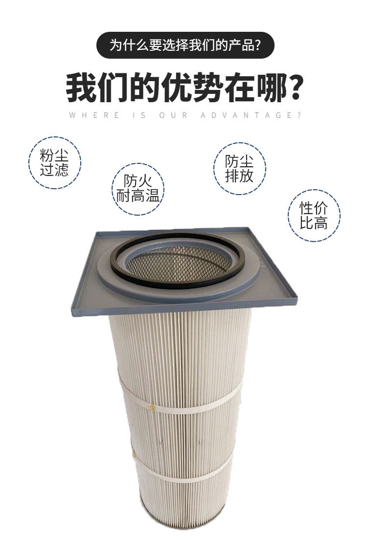 2、聚酯长纤维滤料的应用,使滤筒不仅具有较好的耐酸碱性能,过滤效率更高,运行阻力小,与传统的滤材相比,其具有不可比拟的耐磨性能和高强度、耐破度,脉冲反吹及其它方式更易清灰,而且可用水反复清洗,而不损伤滤材,延长使用寿命