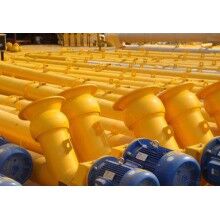 水泥等粉料的输送必须在完全密封的腔体内进行,以免污染环境和输送物料受潮。O形截面的螺旋输送机是应用最广泛的粉料供料输送装置。其机壳采用无缝钢管,常见规格有φ219,φ273,φ325,机壳尾部进口通过球形绞链与筒仓翻板门连接,头部出口通过帆布袋柔软连接通向主体上的粉料秤斗。安装倾角一般在30°~45°之间,必要时可达60°。螺旋的长度不应超过14m,可通过更换中间节段得到不同的螺旋总长度。