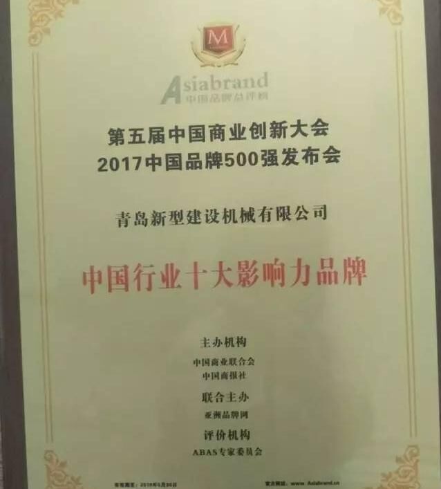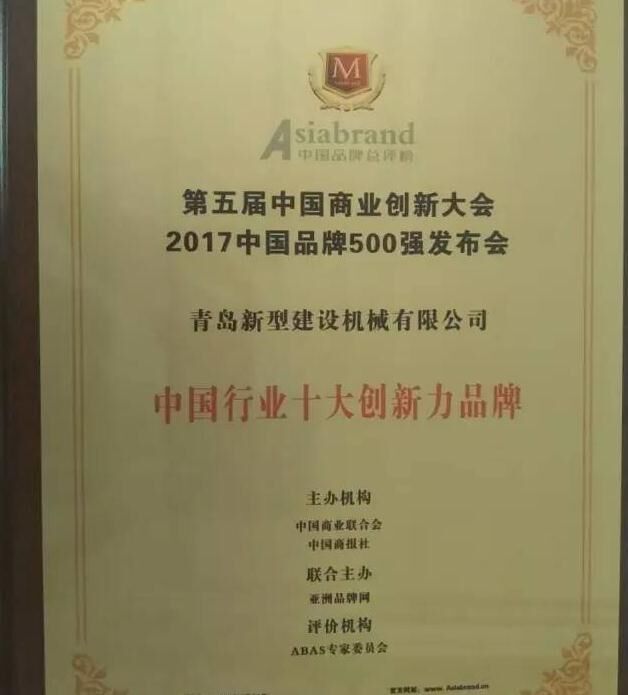 2017年5月31日,以“新品牌、新供给、新未来”为主题的第五届中国商业创新大会暨2017中国品牌500强发布会在北京国家会议中心隆重举行。建筑机械行业知名企业中青林集团旗下青岛新型建设机械有限公司受邀参会,一举荣获“中国行业十大创新力品牌”与“中国行业十大影响力品牌”。