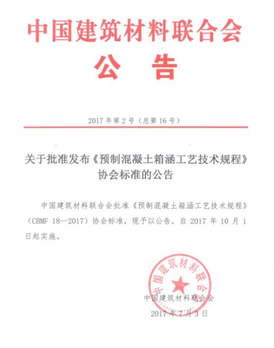 2017年7月,由中国ued网站与水泥制品协会(以下简称协会)组织制定的《预制ued网站箱涵工艺技术规程》和《ued网站用氧化镁膨胀剂》两项协会标准,通过审定并发布批准公告,标准号分别为CBMF 18-2017和CBMF 19-2017,将同时于2017年10月1日起实施。这是国务院《深化标准化工作改革方案》(国发[2015]13号)及质检总局、国家标准委《关于培育和发展团体标准的指导意见》(国质检标联[2016]109号)发布后,协会与中国建筑材料联合会(以下简称联合会)联合发布的首批协会标准,两项标准将公开出版并发行。
