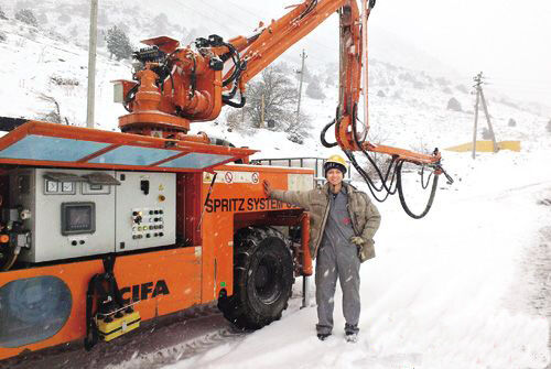 易颖志赶到工地后,发现设备油漆刮擦严重,许多部位变形,与客户协调后,易颖志便开始检测和开机调试。乌兹别克斯坦气温很低,夜间最低温度达到了零下20多度,几台设备都在冰天雪地里,为保证设备尽快能使用,易颖志抵抗着极寒天气在隧道外检测,做各种调试。由于设备发生过碰撞,机械变形问题较多,易颖志担心设备漏油,所以对每个有可能漏油的地方,他都会钻到车底细心检查,随后再检查设备的各项动作和功能是否正常。他自己检测一遍后,再教工地上的当地机手如何使用设备、保养设备,并开机试料,及时给出配比意见。
