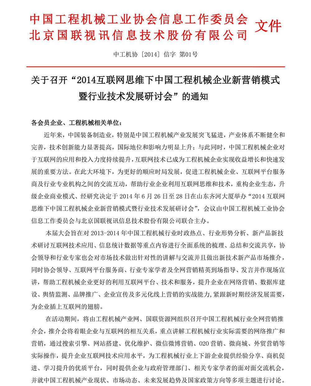 关于召开“2014互联网思维下中国工程机械企业新营销模式暨行业技术发展研讨会”的通知