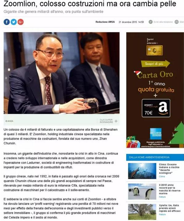 意大利知名国际通讯社安莎通讯社(Agenzia nazionalestampa associata,ANSA)今日在其网站UED(中国)连续重磅发布三篇报道,聚焦中国企业中联重科收购意大利领先环保企业LADURNER(纳都勒)公司,中联重科董事长詹纯新,公司副总裁、环境集团总裁张建国接受了安莎社记者的专访。