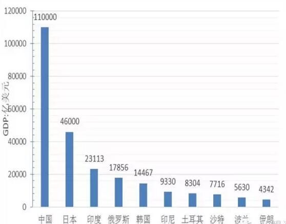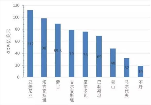 从经济总量看,GDP超过1万亿美元的国家5个,分别为中国、日本、印度、俄罗斯、韩国,其中中国经济总量为11万亿美元、位居第一、为最小国家不丹的5800倍,约占“一带一路”地区经济总量的40%;GDP在5000亿到1万美元的国家4个,分别是印尼、土耳其、沙特、波兰;GDP在1000亿到5000亿美元的国家19个,GDP在100亿到1000亿美元的国家30个;低于100亿元美元的国家8个,分别为塔吉克斯坦、蒙古、吉尔吉斯坦、摩尔多瓦、巴勒斯坦、黑山、马尔代夫、不丹,其中经济规模最小为不丹、GDP为19亿美元。