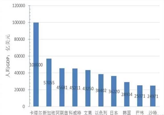 从人均GDP看,贫富差距巨大,最富有国家的人均财富是最穷国家的160倍。人均GDP超过2万美元的国家13个,分别为卡塔尔、新加坡、阿联酋、科威特、文莱、以色列、日本、韩国、巴林、沙特、斯洛文尼亚、捷克共和国、爱沙尼亚,其中卡特尔的人均GDP超过了10万美元、位居第一,为最穷国家阿富汗人均GDP的160倍;人均GDP在1万美元到2万美元的国家13个,人均GDP在5000美元到1万美元的国家13个,人均GDP低于5000美元的国家28个。中国人均GDP8000美元,在“一带一路”沿线国家中位于31名。