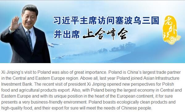 习近平对波兰的访问同样意义大重大。波兰是中国在中东欧地区的最大贸易伙伴。去年,波兰也加入了亚洲基础设施投资银行。习主席的这次访问将为波兰的食品和农产品出口开拓新的局面。此外,波兰是中东欧最大的经济体而且位于欧洲心脏地带,它一定能提供非常有利的经商环境。波兰还提供生态洁净的产品和高质量的食品,它们的出口肯定会满足中国人民的需要。