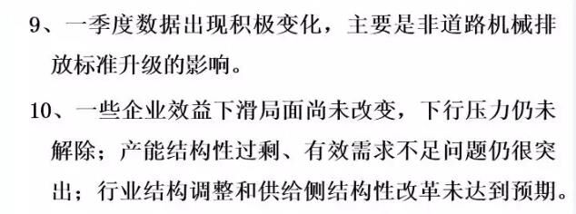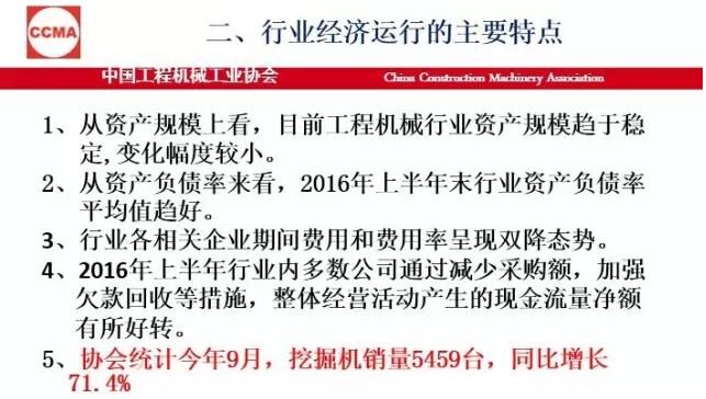 我个人总结,今年的运行情况有这样十个方面。第一,从整个全行业各企业的资产规模上看,目前趋于稳定,变化幅度很小,不像前两年振动那么大。第二,从资产负债率来说,现在负债率是在60%左右,全国的工业企业是56%。所以,这个行业的资产负债率目前看也是很好的。这个需要引起大家的关注和分析,我们也希望后几个月情况可以稳定向好。还有自主品牌市场占有率,在国内市场还是保持高位,从全行业来看在90%以上。那么,产业的集中度又进一步地增强了,但有一些企业挺无助的,出局了,进口额下降。今年按照环保部5号令,全行业工程机械产品实现了新的标准升级。整个产品进行了更新换代,这个非常难能可贵。最后是产能结构性过剩,有效需求不足问题仍然突出,行业结构调整还有供给侧结构改革远远没有达到预期。即便是按照现在的挖掘机销量5500多台,就算是6000台,产能又有多少?一旦市场回暖,一些企业家还是会头脑一热,这样大一个产能释放出来的产量是什么局面?我们必须保持一个清醒的头脑。