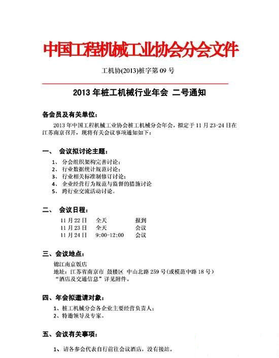 2013年中国工程机械工业协会桩工机械分会年会,将于11月23—24在江苏南京锦江南京饭店召开。会议将邀请桩工机械分会各企业主要经营负责人以及专家学者参会。会议将组织分会组织架构完善讨论、行业数据统计规范讨论、行业相关标准制修订讨论、企业经营行为规范与监督的措施讨论、跨行业交流活动讨论。
