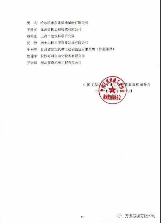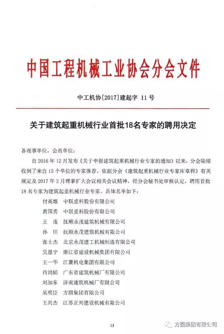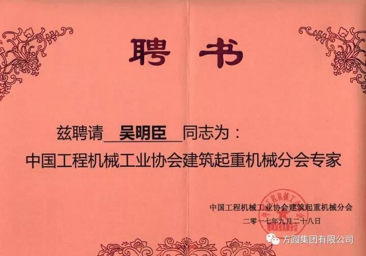 在11月9日召开的中国工程机械工业协会建筑起重机械分会年会上,以中工机协【2017】建起字11号文件公布了《关于建筑起重机械行业首批18名专家的聘用决定》,聘用首批18名专家为建筑起重机械行业专家,方圆集团副总工程师吴明臣名列其中。