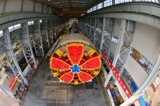 ▲铁建重工自主研制的国产首台常压换刀式超大直径泥水平衡盾构机