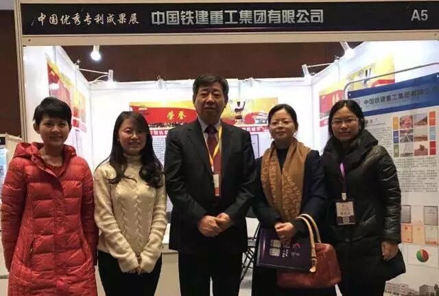 ▲中国铁建董事长、党委书记孟凤朝在中国优秀专利成果展上与铁建重工展区的工作人员合影留念