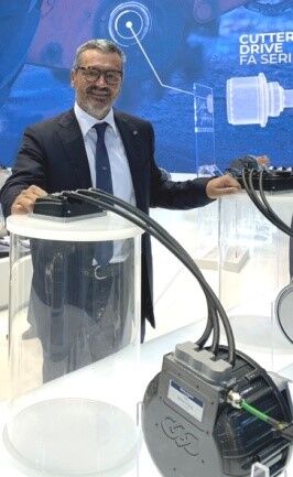 首席执行官Fausto Carboni在慕尼黑举行的2022Bauma展上展示用于建筑机械的新型电力驱动装置。
