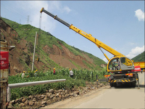 据在现场的徐工服务工程师陆召宝介绍,现场的条件特别艰苦,道路狭窄,有的地方甚至没有一处平整的道路,起重机的支腿无法正常支开,只能在下面多垫几块垫木,以维持车的稳定性与平衡性。就在这种艰难的环境下,徐工起重机凭借优越的行驶能力与吊装性能,将近二十根电线杆一一吊装到位,协助南方电网抢修电路,出色地高效安全完成了吊装任务,使灾区群众基本生活用电得到保障。
