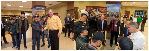 美国中部时间11月11日上午,Cat钢铁英雄争霸赛盟主一行抵达卡特彼勒公司坐落于奥罗拉市的Cat装载机工厂,展开为期两天的卡特彼勒公司参观访问。随后,盟主们辗转皮奥里亚市,重温卡特彼勒百年辉煌之路,访问了生产推土机的卡特彼勒东皮奥里亚工厂和卡特彼勒的访客中心,并在美国中部时间12日下午抵达爱德华兹演示与学习中心,通过遥控驾驶体验了Cat D11T大型推土机。傍晚时分,卡特彼勒董事长兼首席执行官道格拉斯•欧博赫曼与其他公司全球高层热烈欢迎各位盟主的到来,并认真倾听了他们对Cat产品设备的诉求。